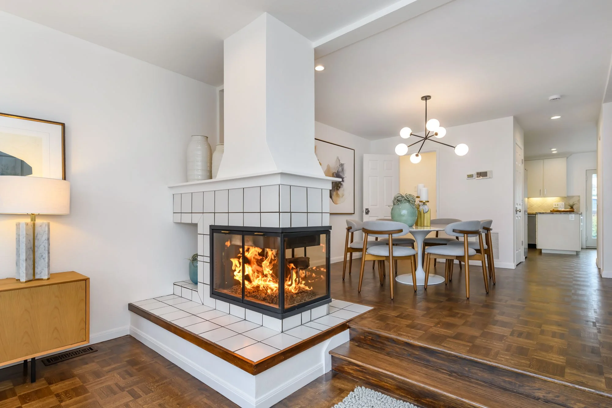 Living room with a corner fireplace, a wooden sideboard, and a modern dining table with six chairs under a geometric chandelier. The room has hardwood floors and white walls. View fullsize