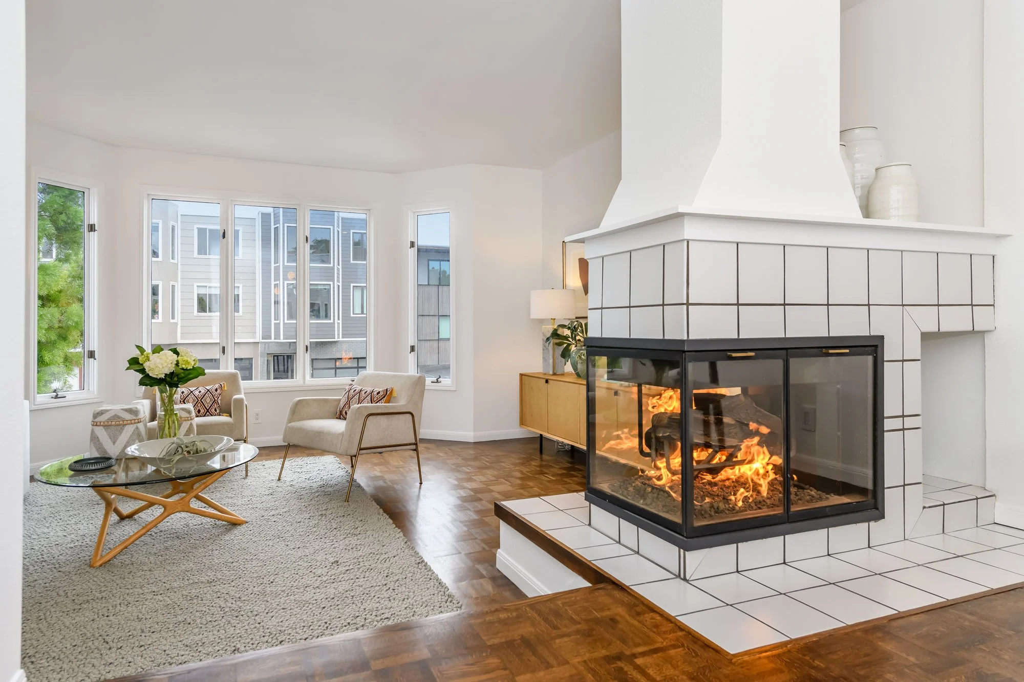 Living room with white walls, hardwood floors, a fireplace with glass doors and a fire burning, a beige armchair, a small wooden sideboard with a lamp, plants, and decorative vases, large windows with a view of neighboring buildings, and a beige text