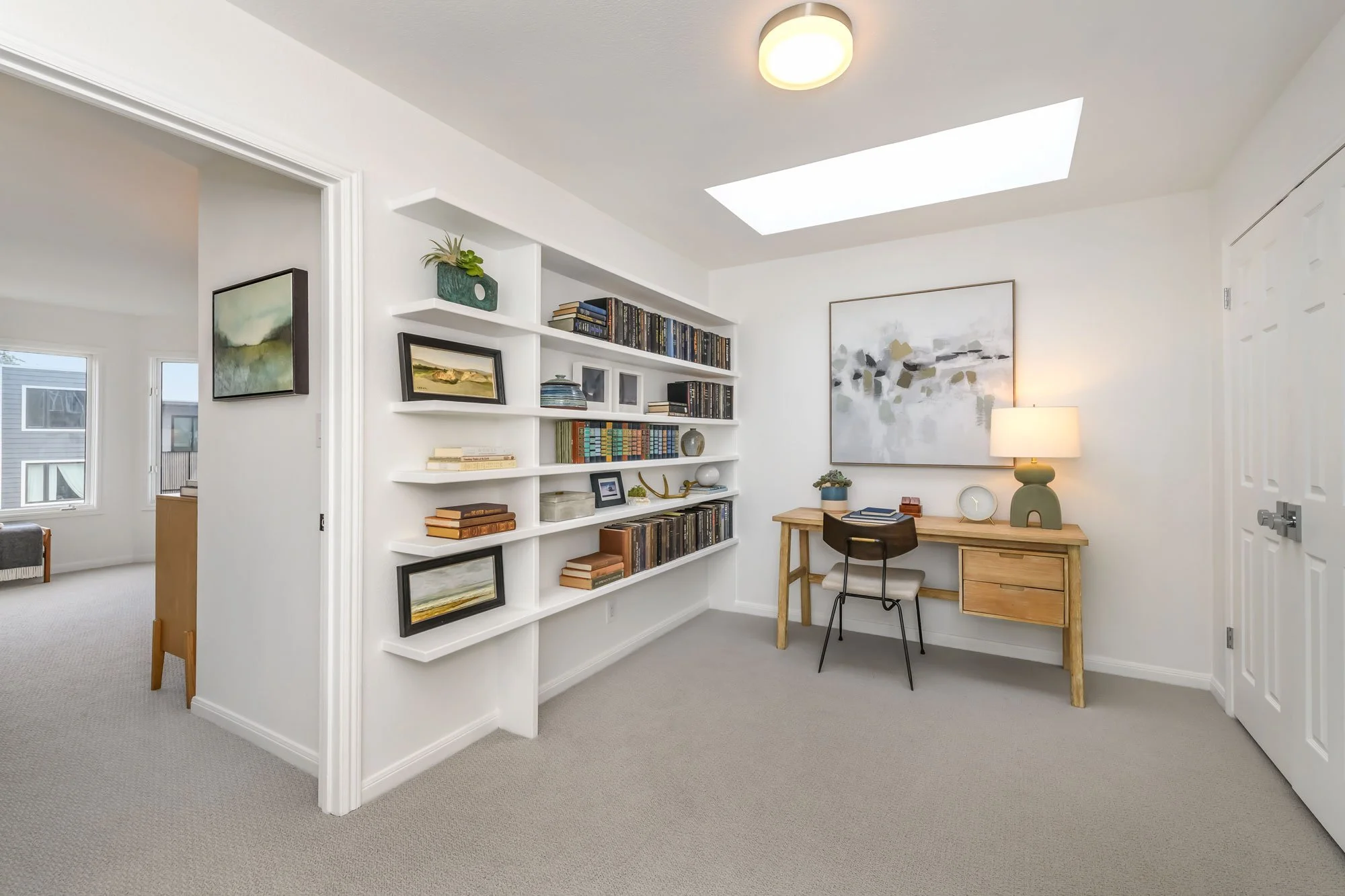Home office area with a wooden desk, a black chair, a table lamp, and framed abstract art on the wall. White built-in shelves with books and decorative items are on the left, and a skylight illuminates the space. Part of a living room with windows is