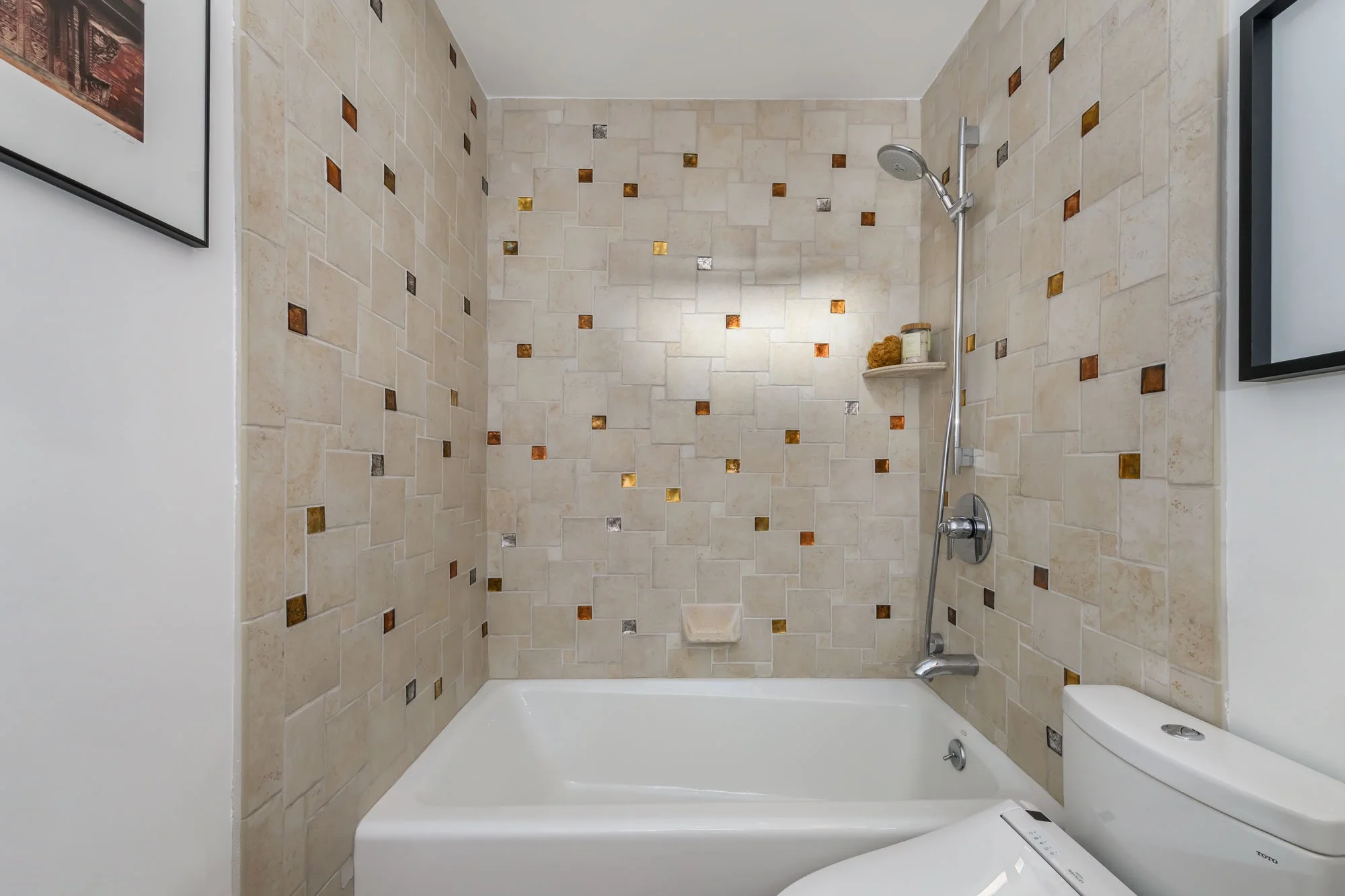 Bathroom with beige tiled shower area with small metallic gold, silver, and brown accent tiles, a handheld showerhead, a small soap shelf, and a portion of a toilet and wall art. View fullsize