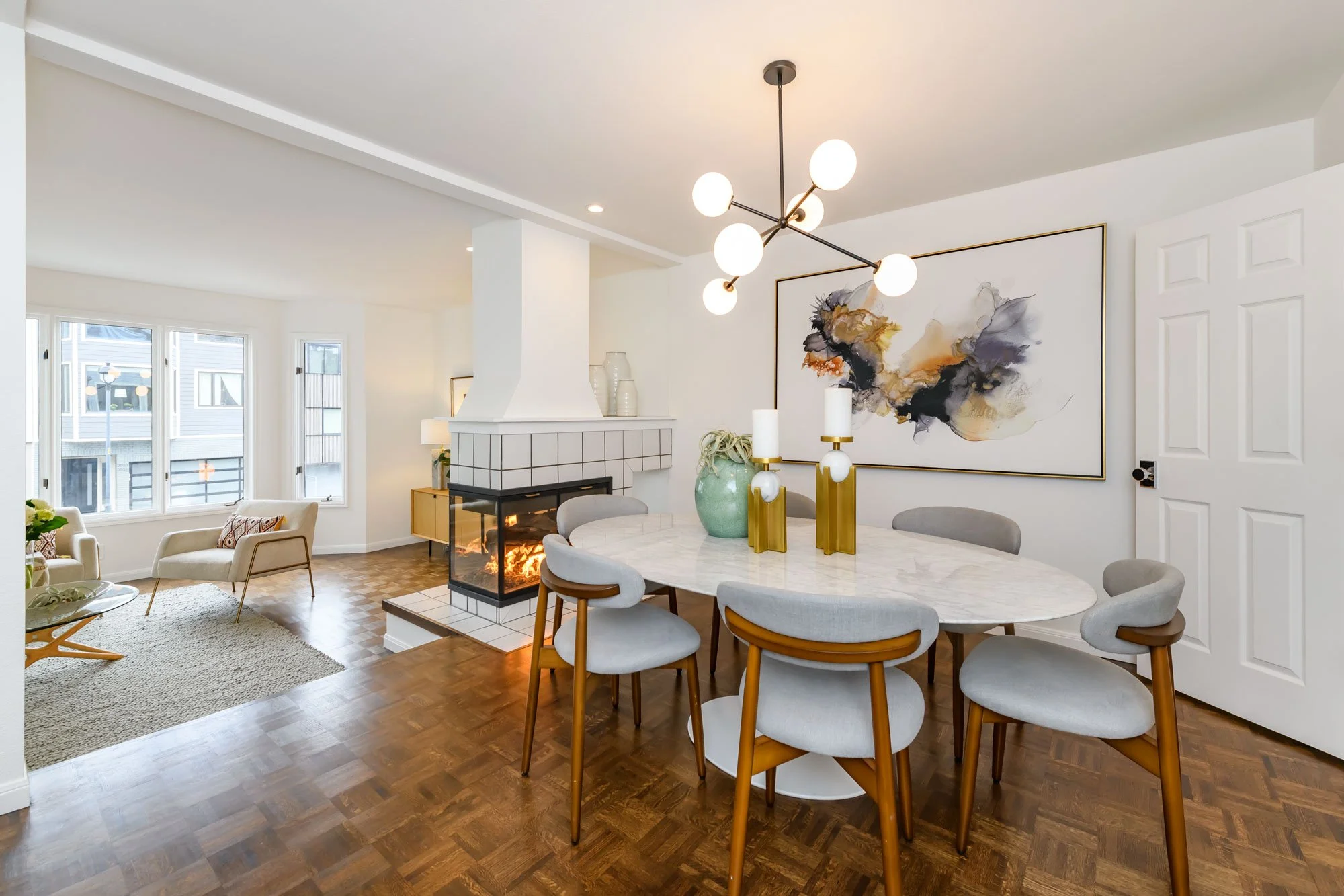 Living room with a corner fireplace, a wooden sideboard, and a modern dining table with six chairs under a geometric chandelier. The room has hardwood floors and white walls.