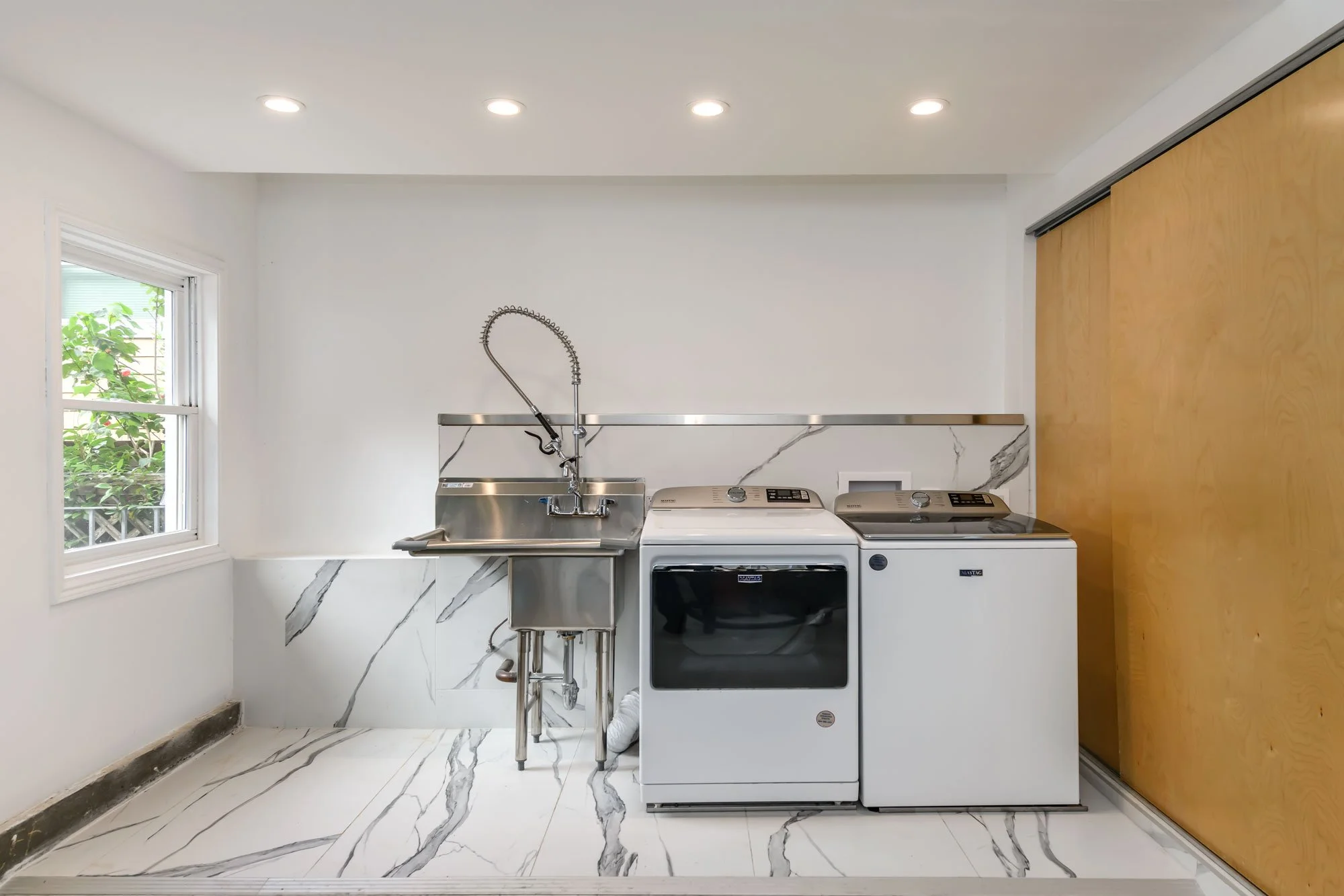 Laundry room with a window, white walls, and a marble-patterned floor and backsplash. Contains a stainless steel laundry sink and faucet, a white washing machine, and a white dryer. There is a wooden sliding door on the right and recessed ceiling lig View fullsize