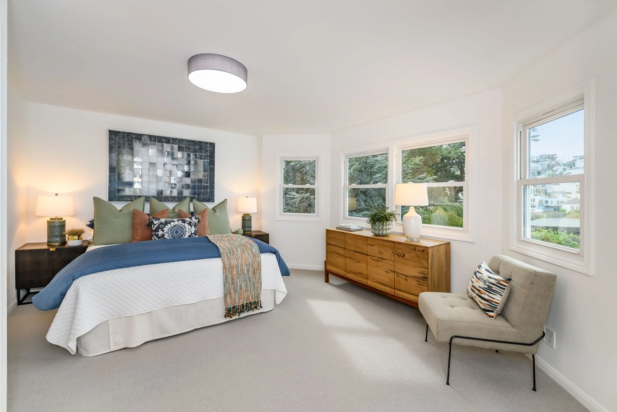Modern bedroom with white walls, large bed with blue, white, and colorful pillows, wooden dresser with a lamp, and a cozy beige chair near windows with greenery outside. View fullsize