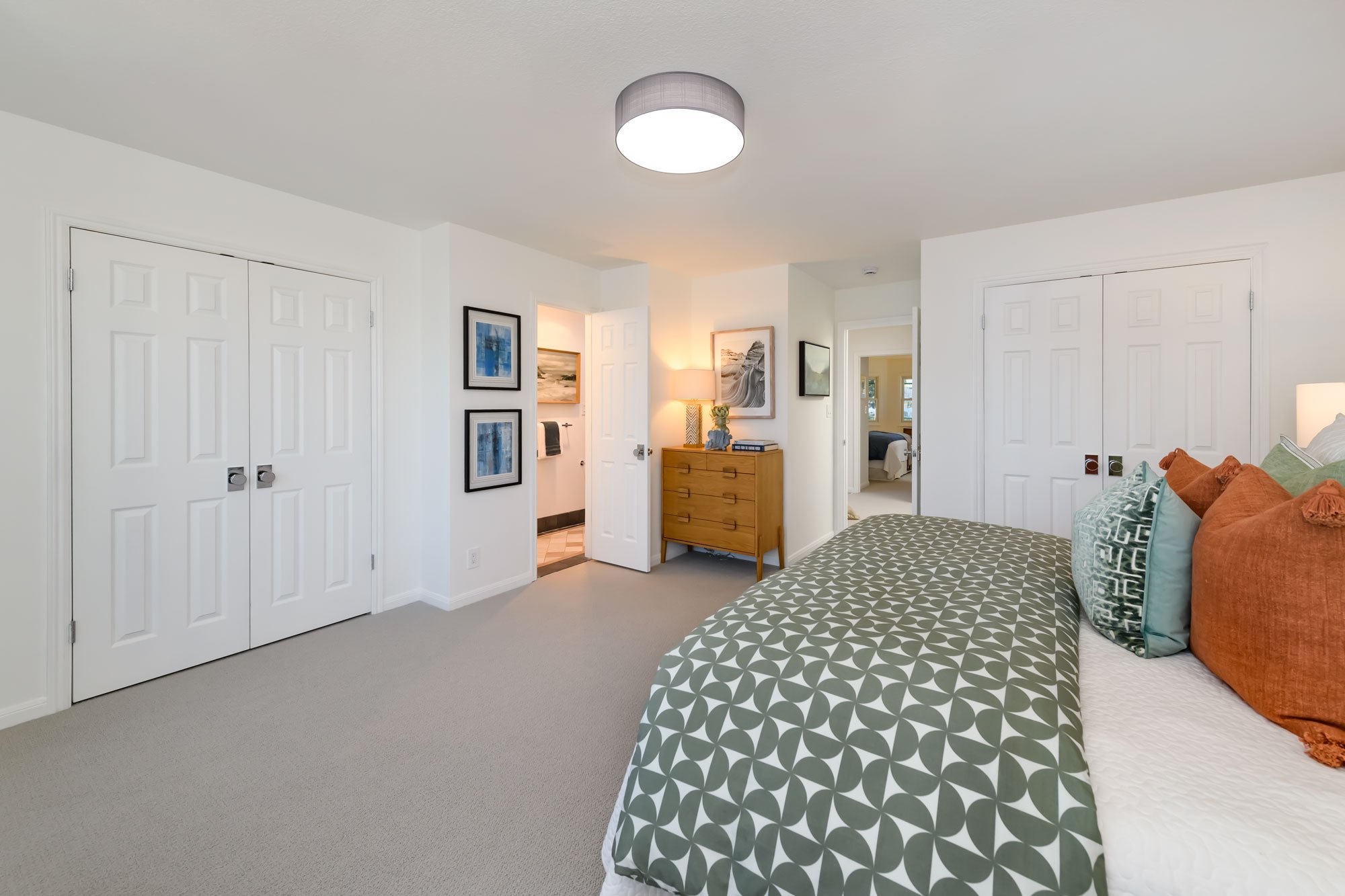 A bedroom with a neatly made bed with green and orange pillows, a wooden dresser with a lamp on top, and sliding closet doors. A doorway leads to a bathroom and another bedroom.