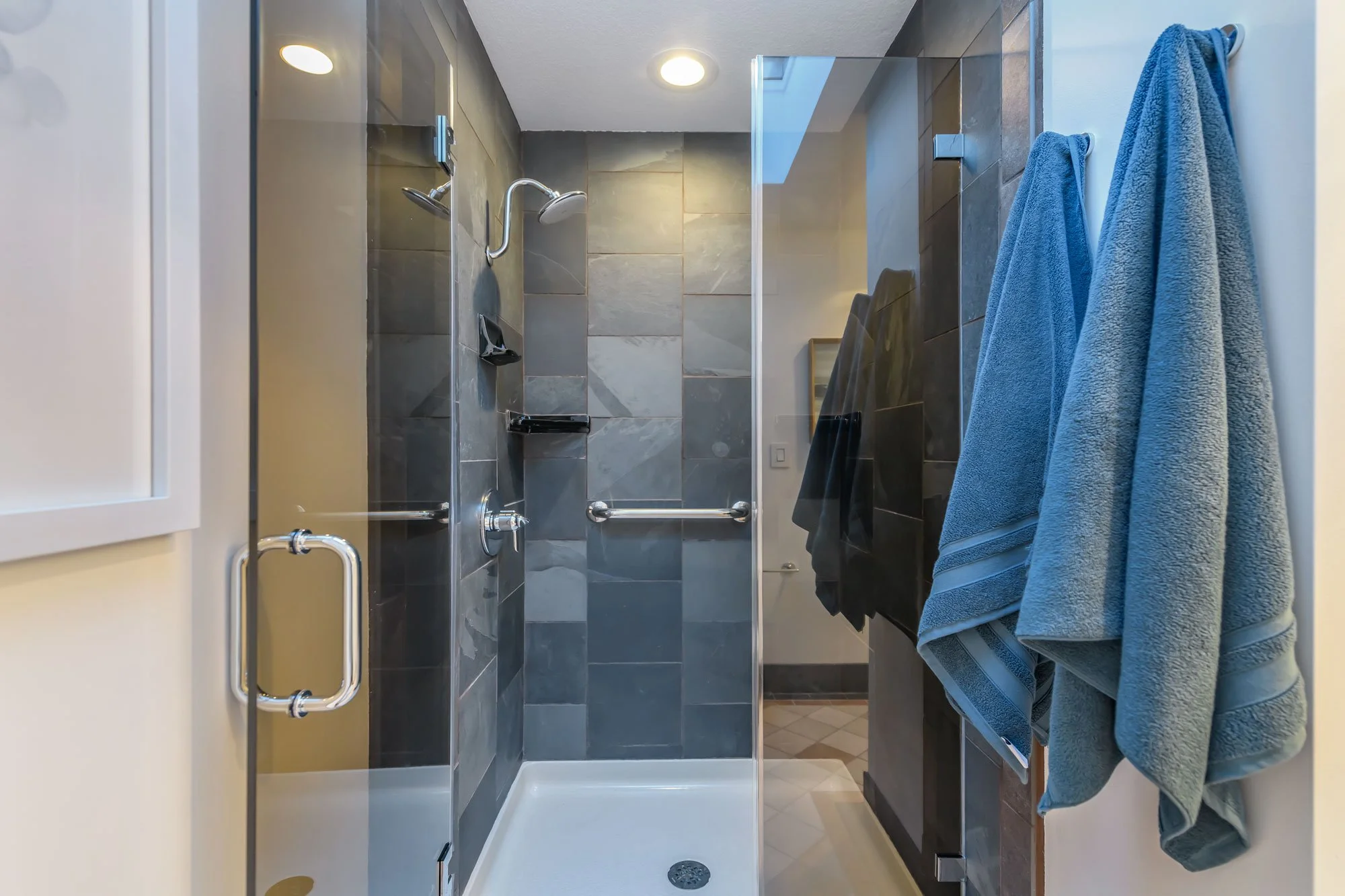 Small modern shower with gray tiles, a glass door, and two towels hanging on hooks outside the shower, one blue and one gray. View fullsize