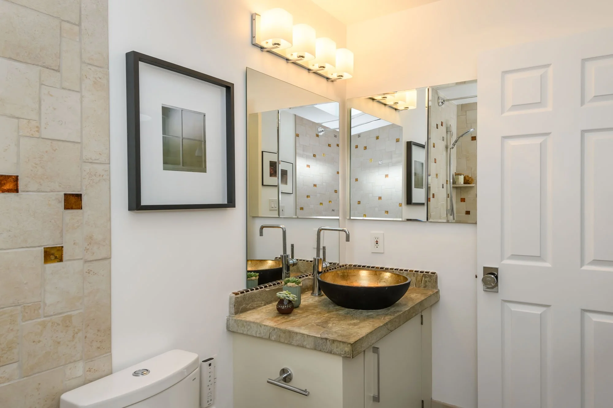 Bathroom with black vessel sink on beige granite countertop, two mirrors, wall-mounted light fixtures, a framed picture on the wall, and a partially open white door. View fullsize
