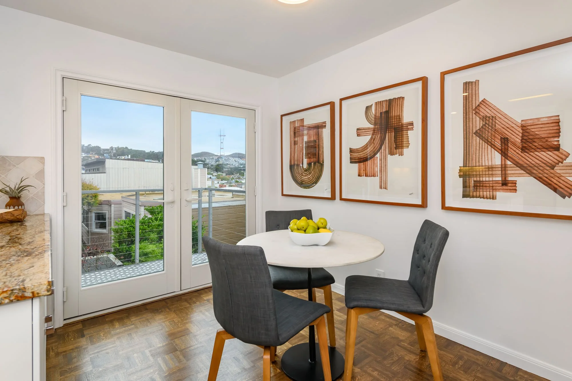 Dining area with a round table, three gray chairs, a bowl of green apples, and three framed abstract artworks on white walls, adjacent to a glass door leading to a balcony with a view of buildings and hills. View fullsize
