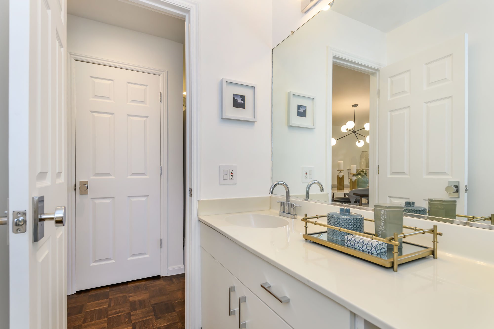 A bathroom with a white countertop, a sink with a modern faucet, a large mirror, and two small framed pictures on the wall. The room has white walls, and there is a view into an adjacent room with a chandelier and decorative items. View fullsize