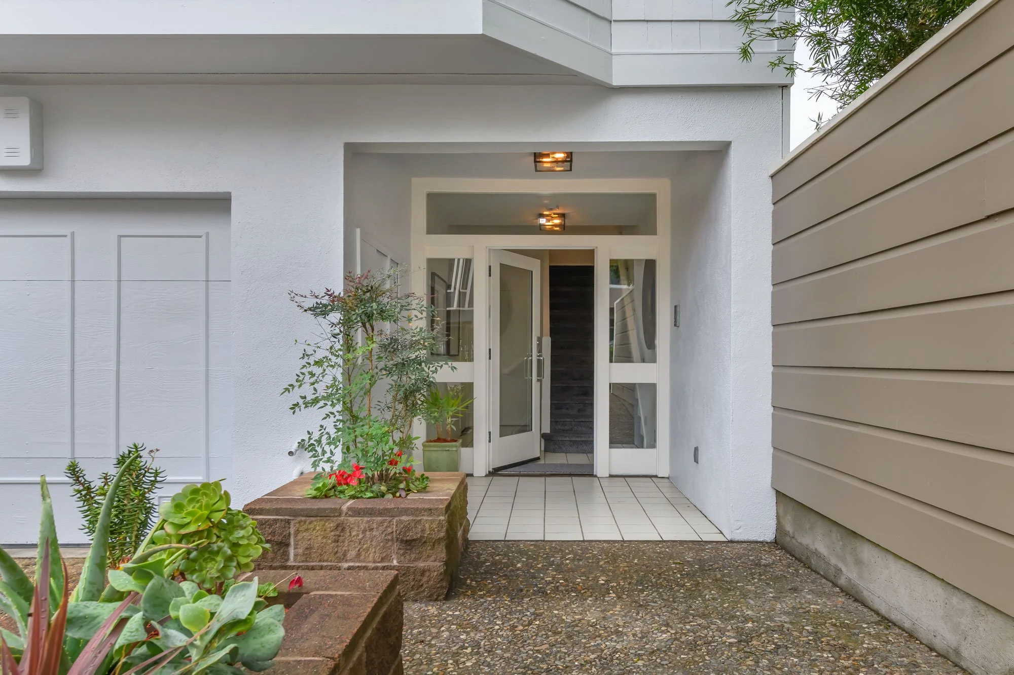 Entrance of a modern house with white walls, a glass door, and outdoor plants in planters, leading to a staircase inside. View fullsize