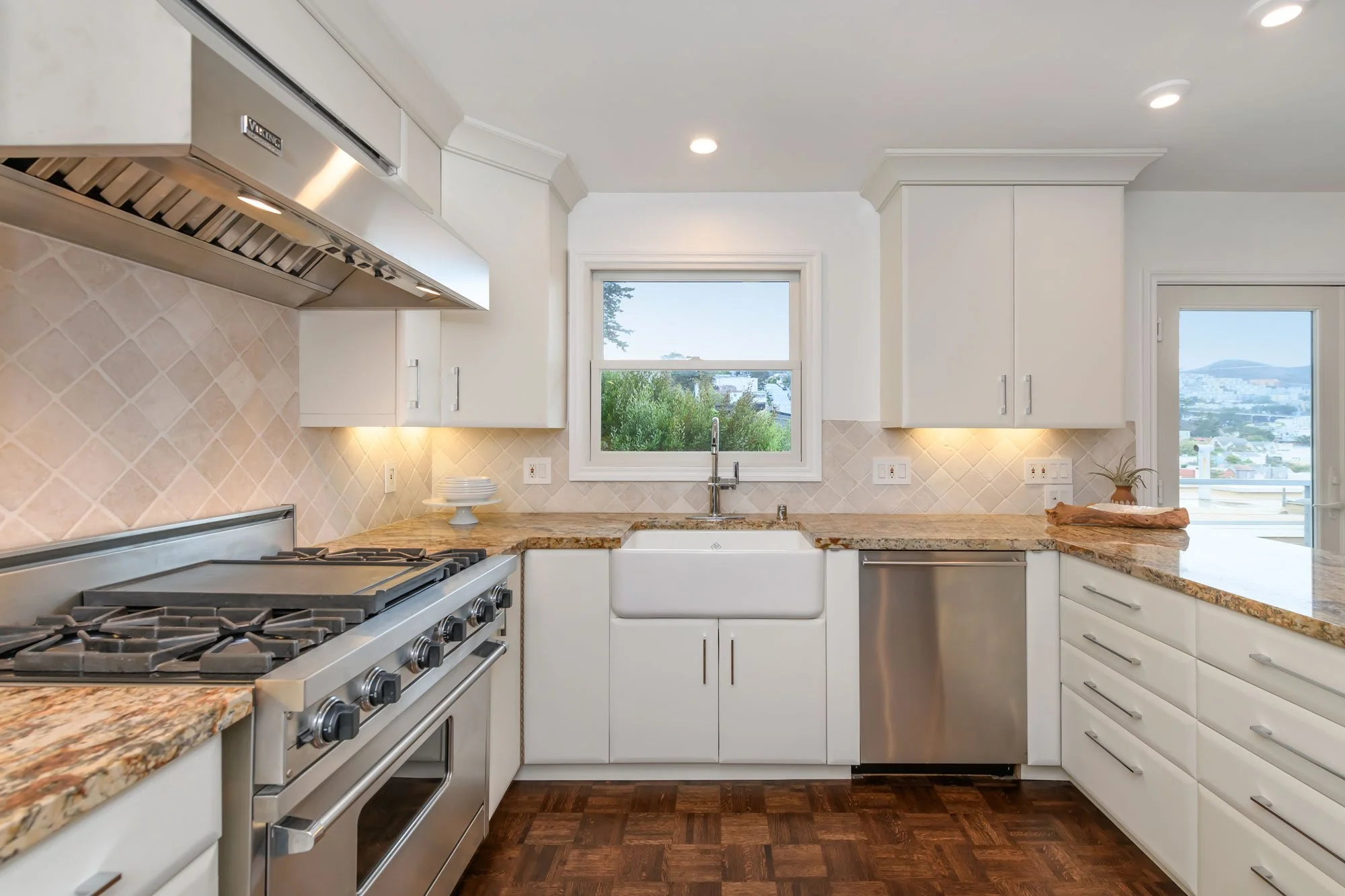 Modern kitchen with white cabinets, granite countertops, and stainless steel appliances, including a gas stove, dishwasher, and range hood, with a window over the sink showing a view of trees and city buildings.