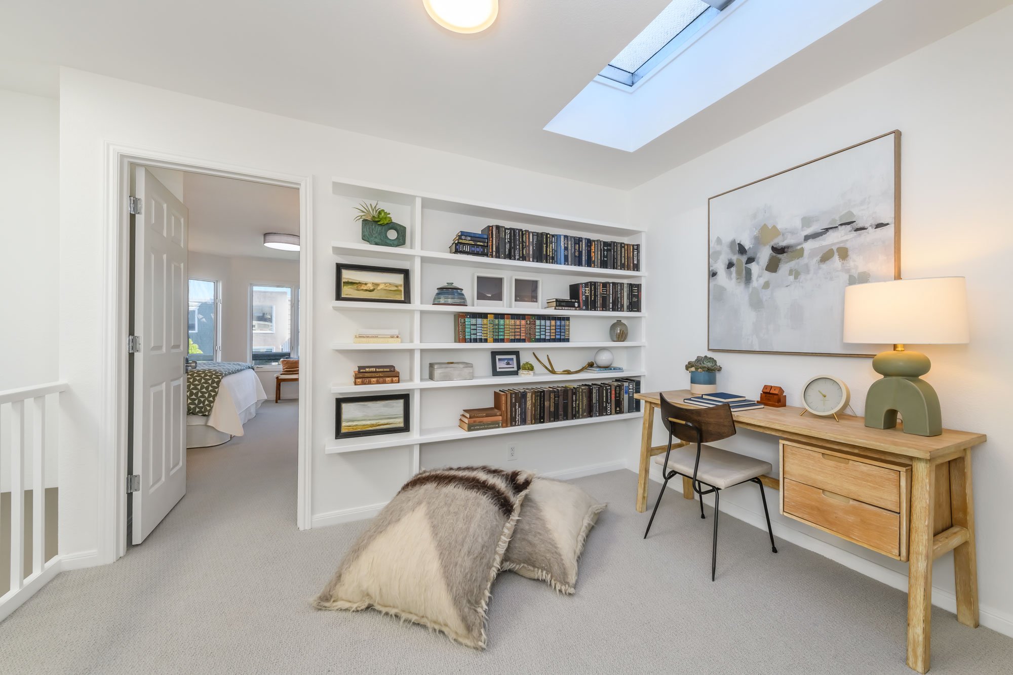 Home office area with a wooden desk, a black chair, a table lamp, and framed abstract art on the wall. White built-in shelves with books and decorative items are on the left, and a skylight illuminates the space. Part of a living room with windows is View fullsize