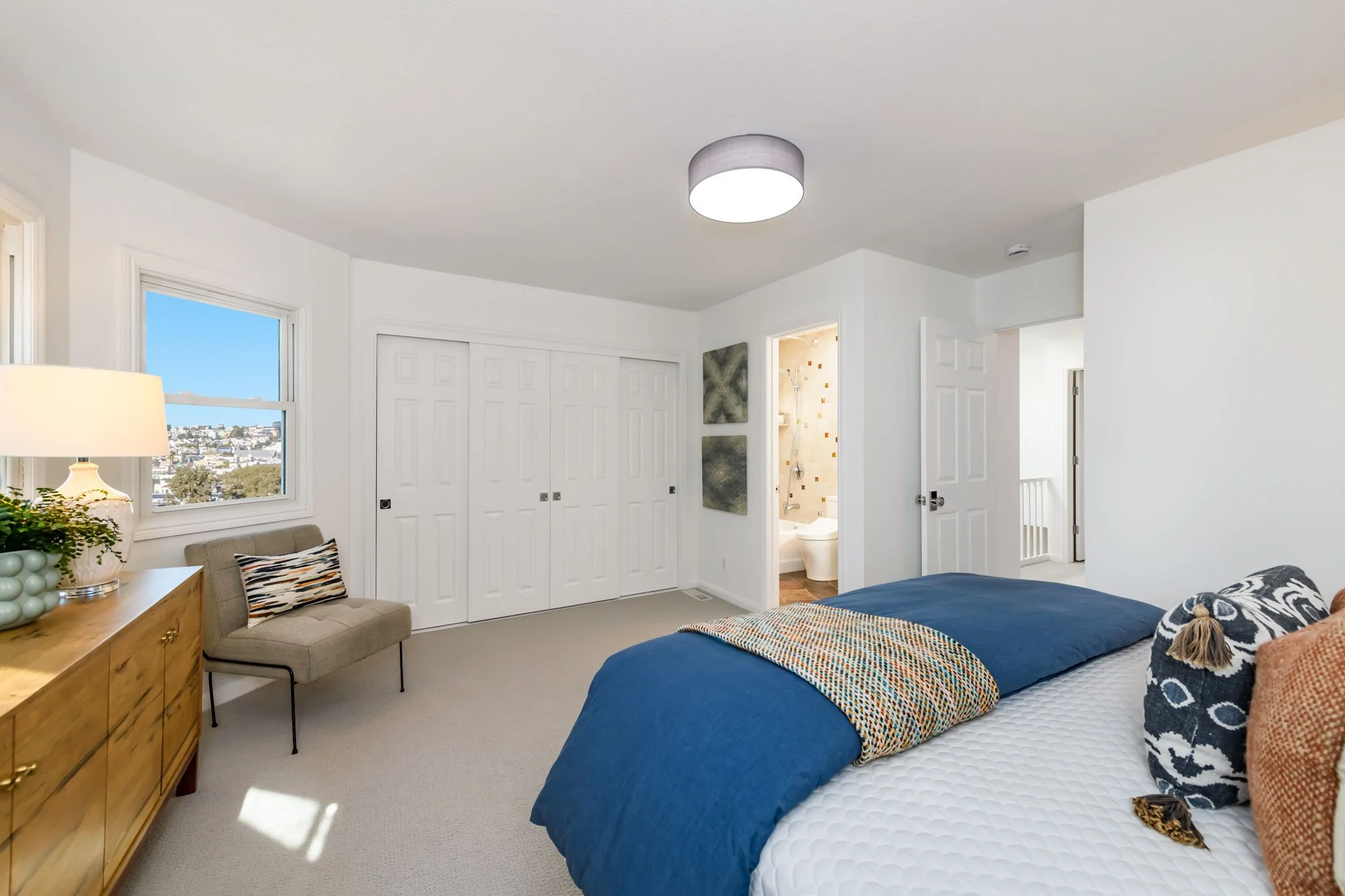 Bedroom with white walls, a blue bedspread, decorative pillows, a wooden dresser with a lamp, a window showing a city view, and an open door leading to a bathroom.