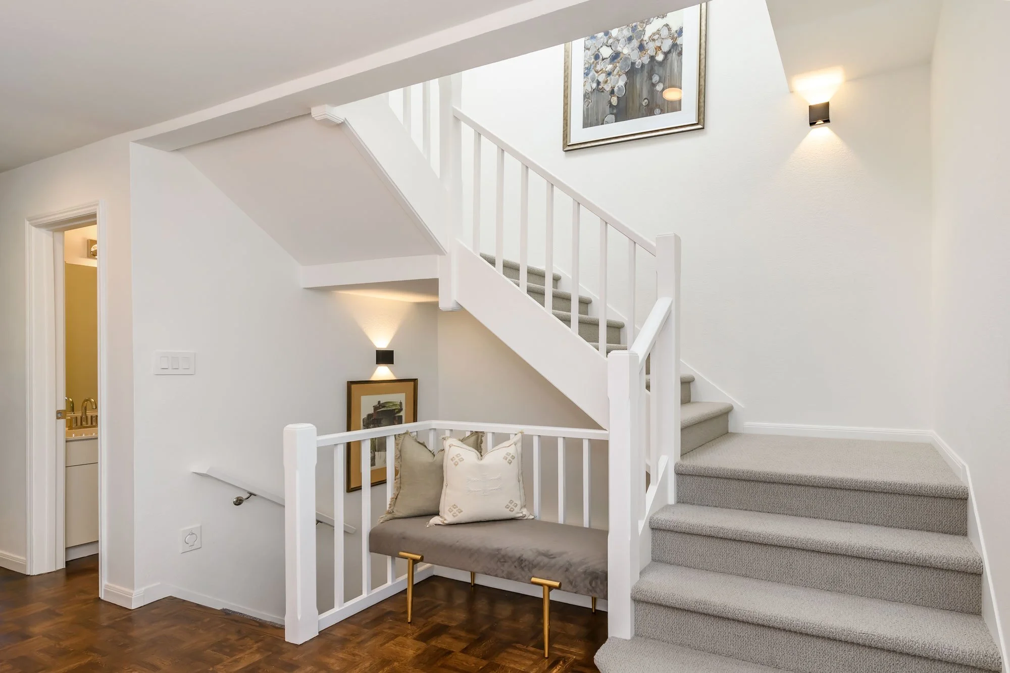 Interior view of a modern staircase with white railings, carpeted stairs, and a cozy gray bench with pillows beneath the staircase. There are framed pictures on the wall and decorative wall sconces providing warm lighting.